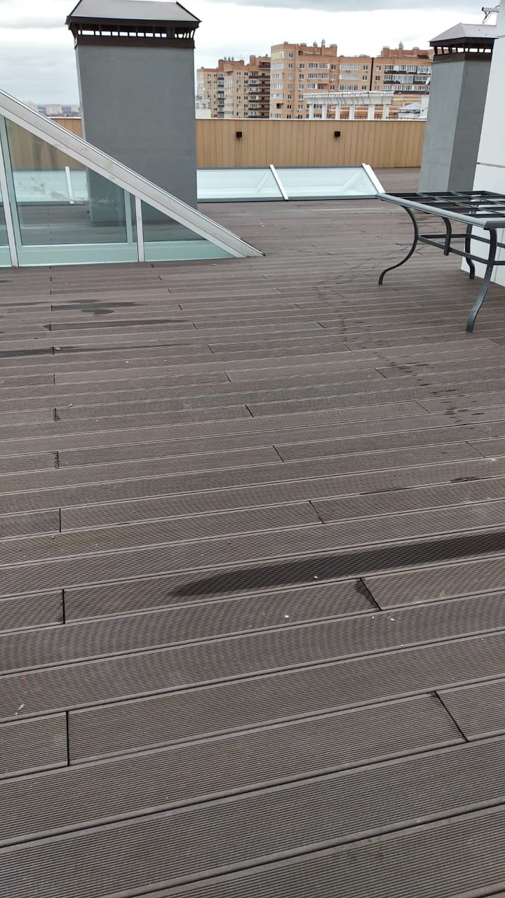 Краснодар, эксплуатируемая кровля, частное домовладение, декинг вельвет классик коричневый, сайдинг винтаж натуральный